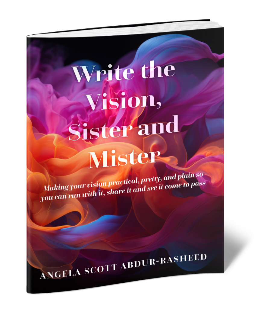 Write the Vision, Sister and Mister draws on the impact of Angela Abdur-Rasheed’s years of vision board training for individuals, organizations, and corporations, and decades of proven goal setting and personal development facilitation helping birth the vision for others.